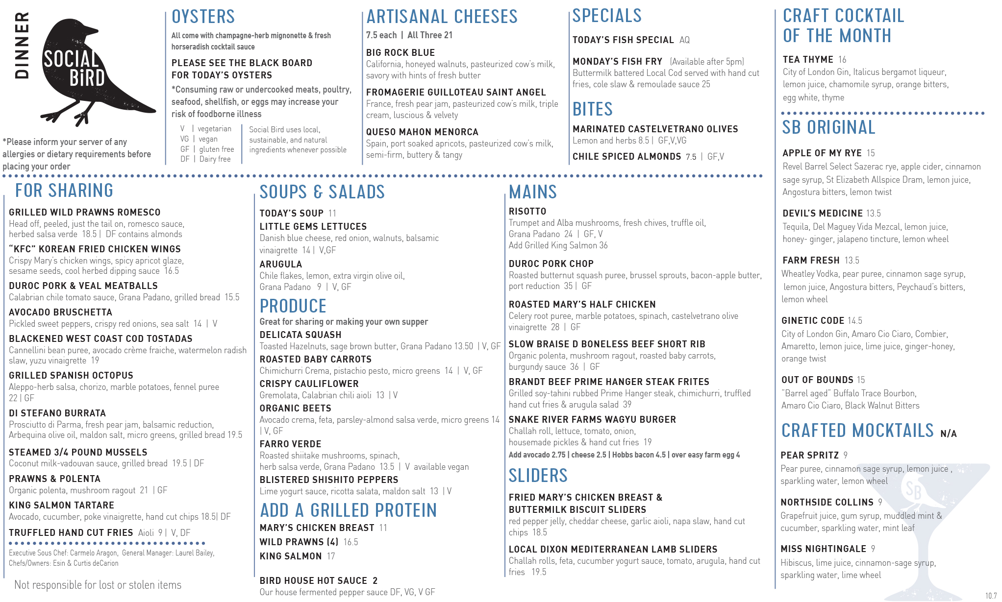 social bird kitchen & bar Dinner Menu SIGNATURE DISHES | UNIQUE WINES | HANDCRAFTED COCKTAILS Takeout Orders SAMPLE MENU. ITEMS SUBJECT TO CHANGE